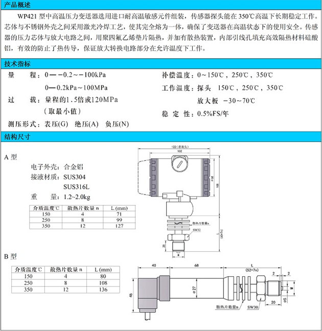 wp421型中高溫壓力變送器選用進(jìn)Kou耐高溫敏感元件組裝,傳感器探頭能在350C高溫下長期穩(wěn)定工作。