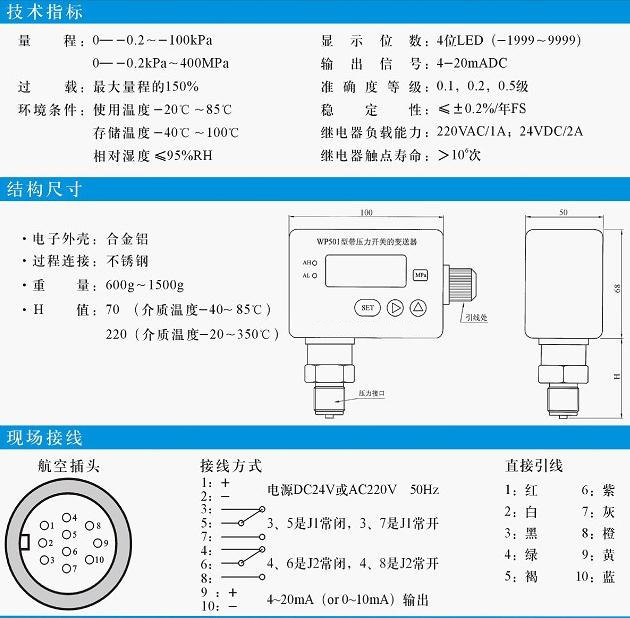 wp501型帶開關的壓力變送器采用世界優(yōu)秀的傳感器芯片為測壓元件,技術優(yōu)秀,質量可靠,精度高,穩(wěn)定性好,體積小,重量輕,可直接過程安裝,帶數(shù)字顯示,并有二線制4- 20mA輸出,可供DCS、PLC或二次儀表使用,同時輸出上、下限開關量信號供控制或報警使用。上、下限報警值在量程范田內連續(xù)可調。該產品可廣泛用于石油、化工、天燃氣、電力、醫(yī)藥、食品、印染、造紙、科研等領域。